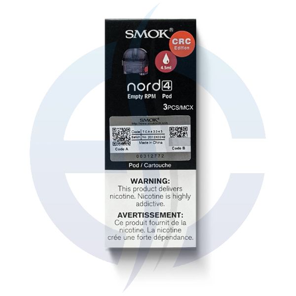 Compatible with the SMOK Nord 4 Refillable pod system, The SMOK Nord 4 Empty Pods are available in two different options: RPM Coil compatible and RPM2 Coil compatible. The pods have a 4.5 mL capacity, side refill system plus a plug and play coil system with a safety latch for CRC compliance.
